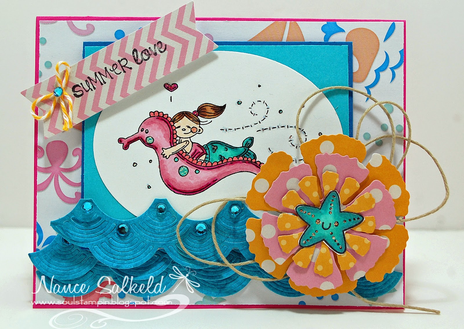 EXTRAS: Sentiment stickers; Rectangle stitched mats (Reverse Confetti); small circle die (Spellbinders); triangle die (Spellbinders); Striped ribbon; Pier button; tan hemp cord (for sailor's knots).